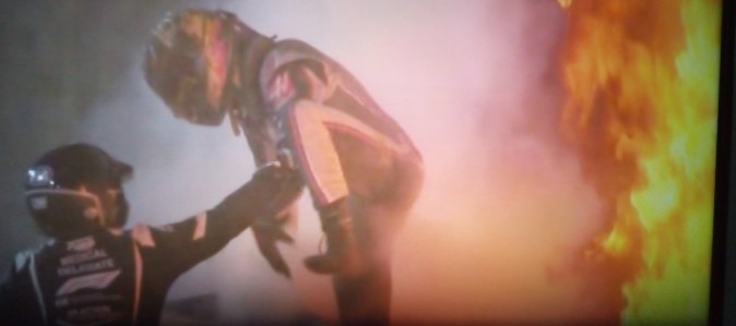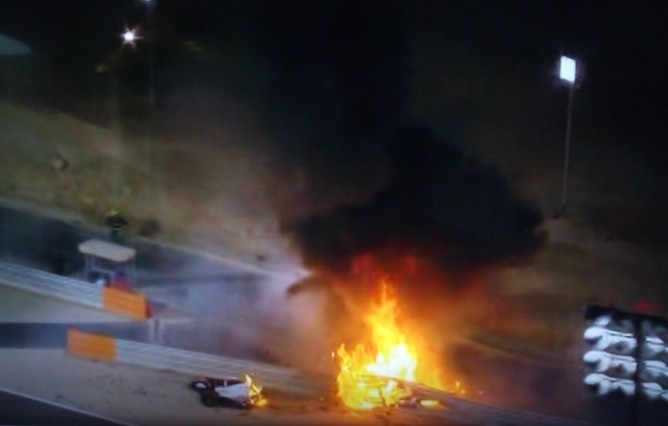Oh wei... Schwerer Unfall gleich in der ersten Runde. Grosjean hat es erwischt... seitlich raus, Crash, und man hat nur einen Feuerball gesehen.
