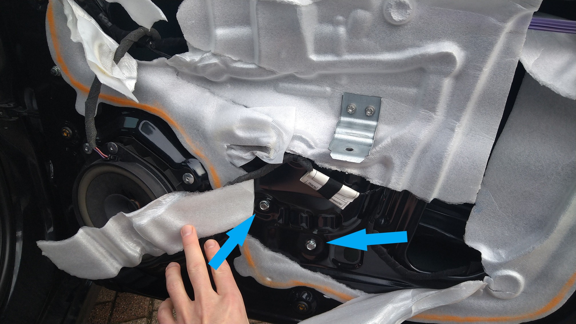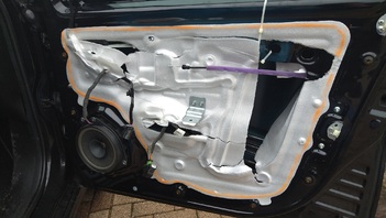 Scheibe ganz nach oben, Kabelbinder durch das Loch in der Scheibe gezogen und an der Tür verspannt. Dann die Türverkleidung wieder drauf. Allerdings bekam ich nicht so einen Zug auf die Scheibe, dass sie ganz oben blieb. Daher habe ich kleine Fließenlegerkeile aus Holz zwischen Scheibe und Dichtleiste (von innen) gesteckt und das ganze mit Klebeband fixiert und abgedichtet, weil es beim Fahren doch ziehmlich nervende Pfeiftöne gemacht hat.