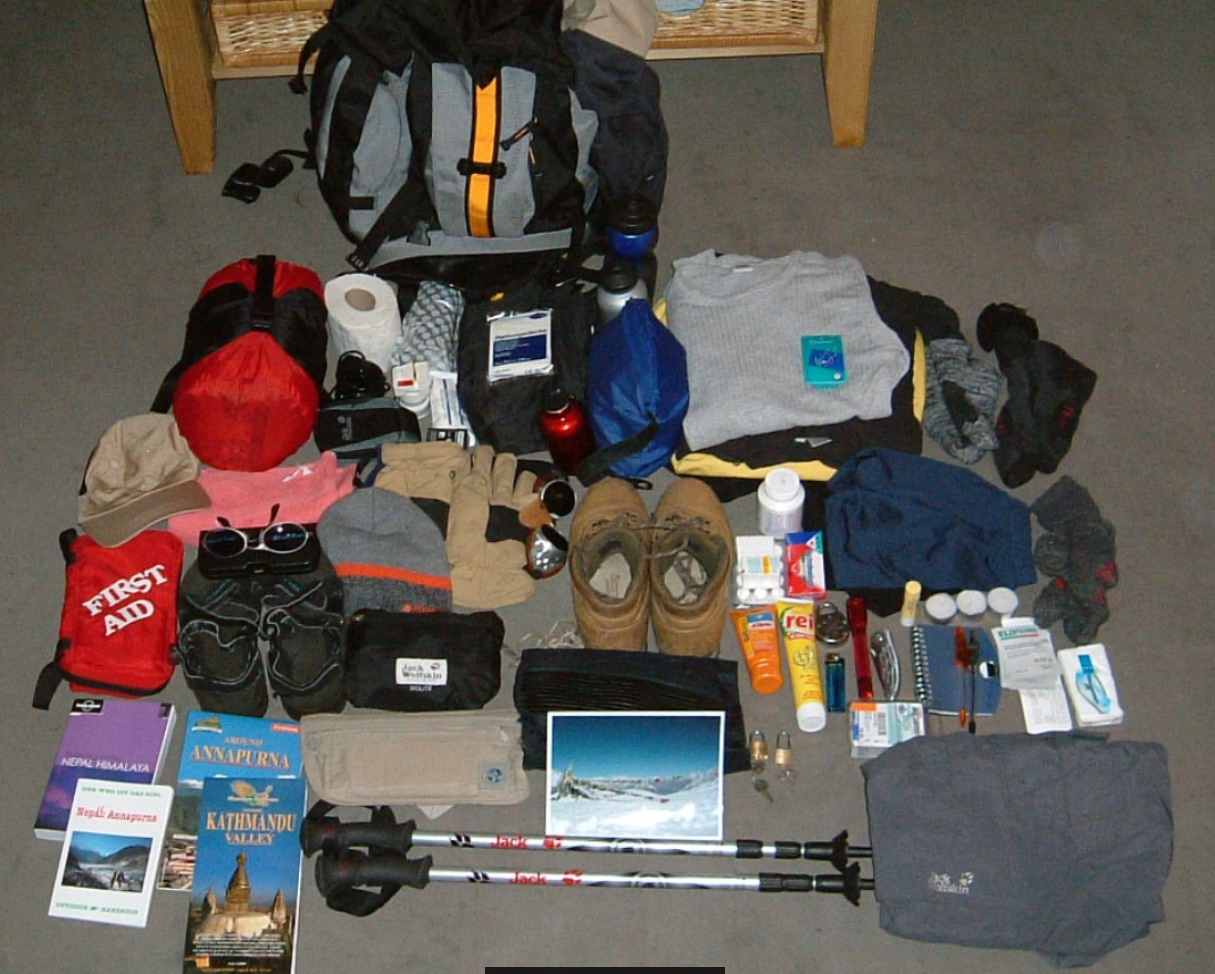 Hab noch was Schönes gefunden. Auf folgendem Bild seht Ihr, was ich vor einem Jahrzehnt für einen 4-wöchigen Himalaytrip (Annapurnarunde) alles im Rucksack hatte; nicht viel mehr war es 2006 für einen 6-Monatstrip in Asien (Indien, Nepal, Iran). Weniger ist häufiger mehr; wenn ich sehe was heutzutage eine Familie so ins Auto verfrachtet. Meine Frau sagt dann wieder "Ja, damals.....", aber ich schwelge noch bis an mein Lebensende von diesen Erfahrungen und der "Nicht-Vollkasko-Urlaubsreise" mit low budget.