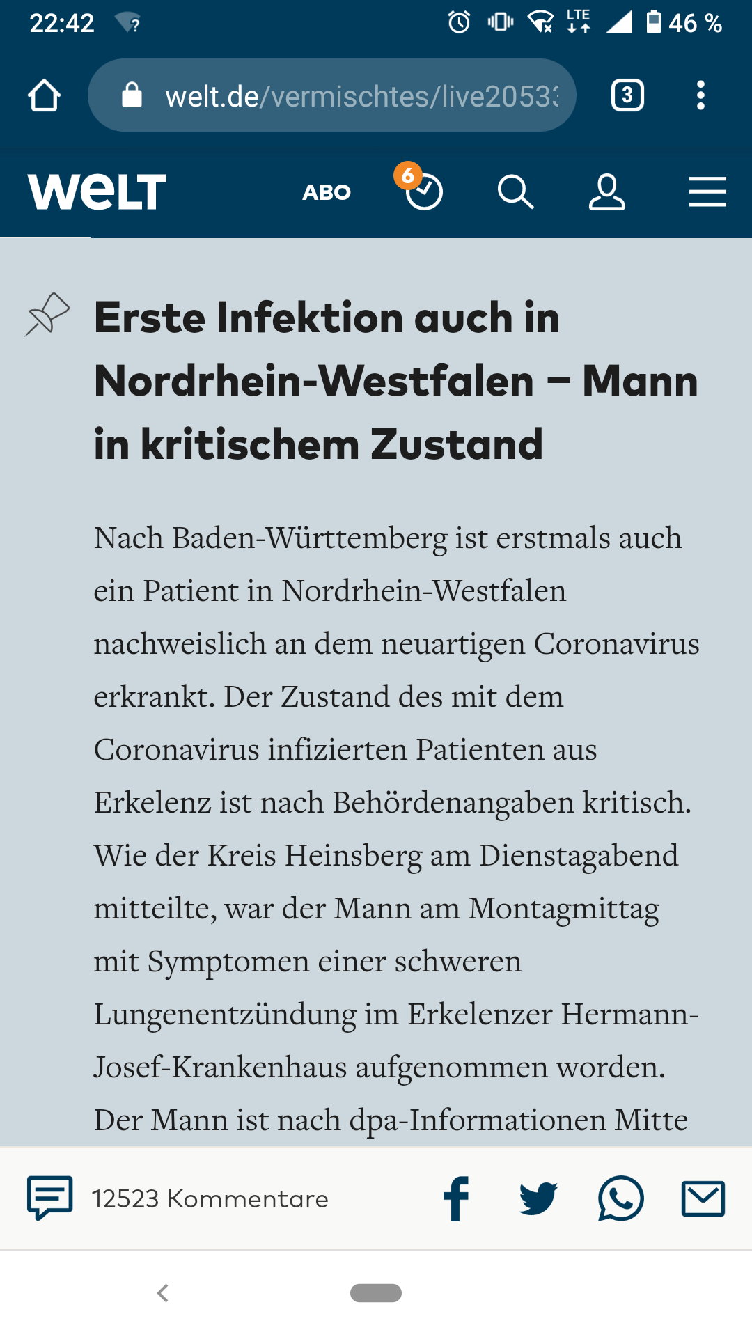 Erster Fall von Corona-Erkrankung in Nordrhein-Westfalen
