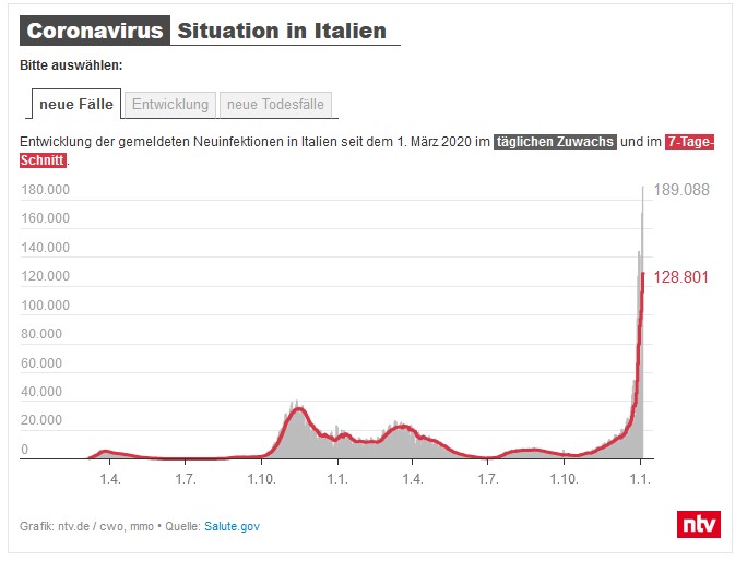 Italien hat einen weiteren Höchststand bei den täglichen Corona-Neuinfektionen erreicht. Die Gesundheitsbehörden in dem 60-Millionen-Einwohner-Land meldeten mehr als 189.000 Ansteckungen binnen eines Tages, wie aus Daten des Gesundheitsministeriums hervorgeht. 230 Menschen starben in Zusammenhang mit dem Virus. Am Abend trifft sich der Ministerrat im Amtssitz von Regierungschef Mario Draghi in Rom. Erwartet wird, dass weitere Einschränkungen beschlossen werden. Insidern zufolge prüft die Regierung eine Impfpflicht für über 50-Jährige. -