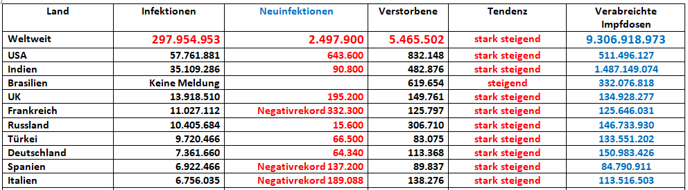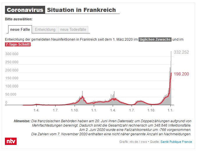 Frankreich hat mit mehr als 330.000 gemeldeten Corona-Infektionen innerhalb eines Tages einen Rekordwert verzeichnet. Nach Angaben der französischen Gesundheitsbehörde vom Abend wurden binnen 24 Stunden 332.252 Neuinfektionen registriert. Der Inzidenzwert lag landesweit bei 1851. Angesichts dessen plant die Regierung drastische Einschränkungen für Ungeimpfte. Ab Mitte Januar sollen sie keinen Zugang mehr zu Restaurants, Kinos oder Fernzügen haben. Noch ist das Gesetzesvorhaben aber nicht vom Parlament beschlossen.