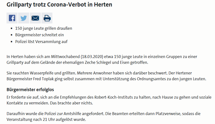 • Von daher: Es muss eine Ausgangssperre geben!!! Und das muss dann auch konsequent kontrolliert und gegebenenfalls geahndet werden!!! Die Schwachmaten lernen es nicht anders...
