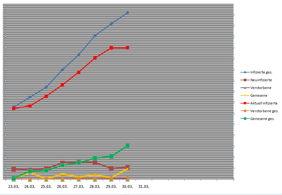 • ich will dich ja nicht entmutigen... aber auch bei uns war Montags immer ein verminderter Anstieg... Grund: Wochenende - weniger Datenübertragung - weniger Fälle. Leider.