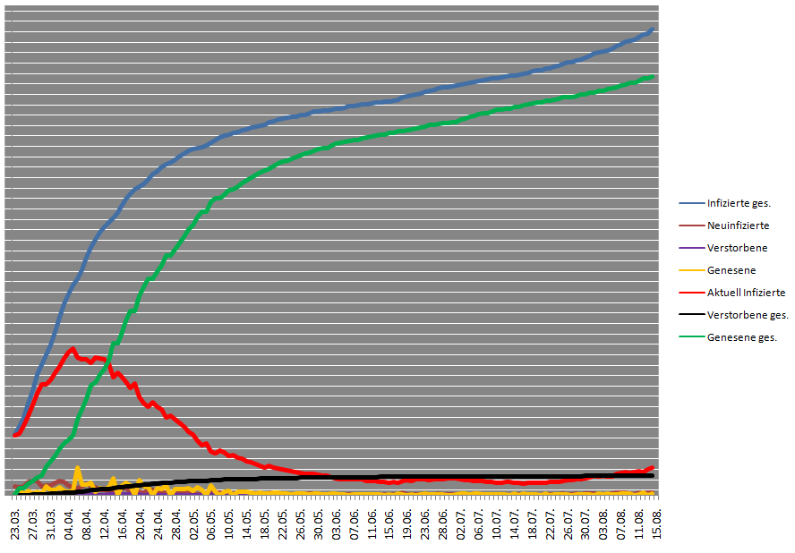 Mein Frau ist die ganze Woche schon wieder täglich an der Schule, so wie immer in der letzten Sommerferienwoche: Konferenz, Klassenräüme umgestalten, Bücher inventarisieren, etc. Die Stimmung unter den Kollegen bzgl. Corona und bzgl. des Schulbeginns nächste Woche kann man nur mit 3 Worten beschreiben: Alle sind besorgt. Letzten Endes weiß jeder, dass das mit dem Abstand halten in den kleinen Klassenräumen bei der Vielzahl Schüler absolut nicht umsetzbar ist, und vom Großteil der Schüler weiß man, dass diese in den Ferien in Hotspotregionen wie Kroatien, Bulgarien, etc. waren. Man darf gespannt sein, wie die kommenden Wochen verlaufen werden. Mir ist da schon etwas mulmig.