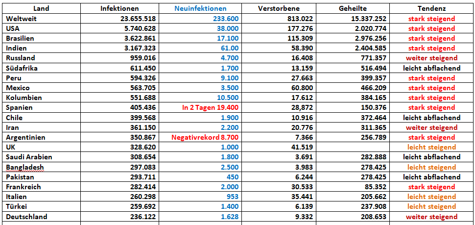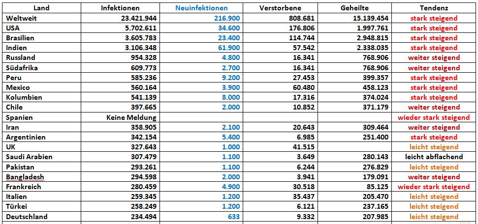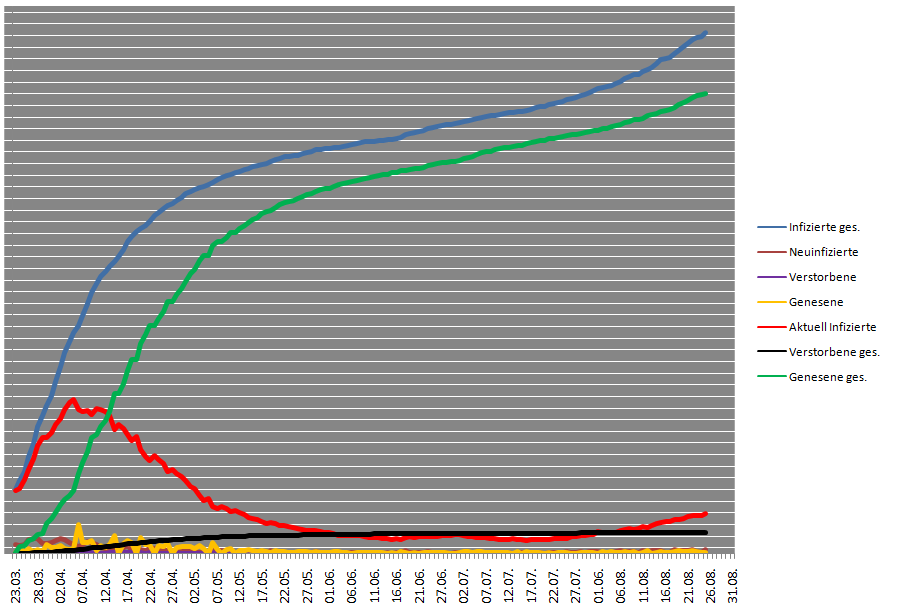 Ich frage mich ernsthaft, ob Deutschland wieder auf das Niveau von 200-300 Neuinfizierte, wie es vor ein paar Wochen einmal war, zurückkommen kann. Ich glaube es ehrlich gesagt nicht, zumal jetzt bald die nasskalte Jahreszeit beginnt.