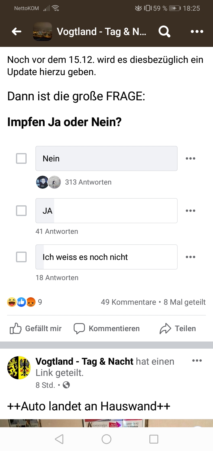 wird niemals umsetzbar sein... Dafür wehren sich zu viele.. Und das ist nur eine Facebook Umfrage. Für den Vogtlandkreis. .. Dunkelziffer ist garantiert 10x so hoch.. Aber das wird überall so sein! Da frage ich mich, wie die Medien an Infos kommen, dass sich die Mehrheit der deutschen impfen lassen möchte! Amen!