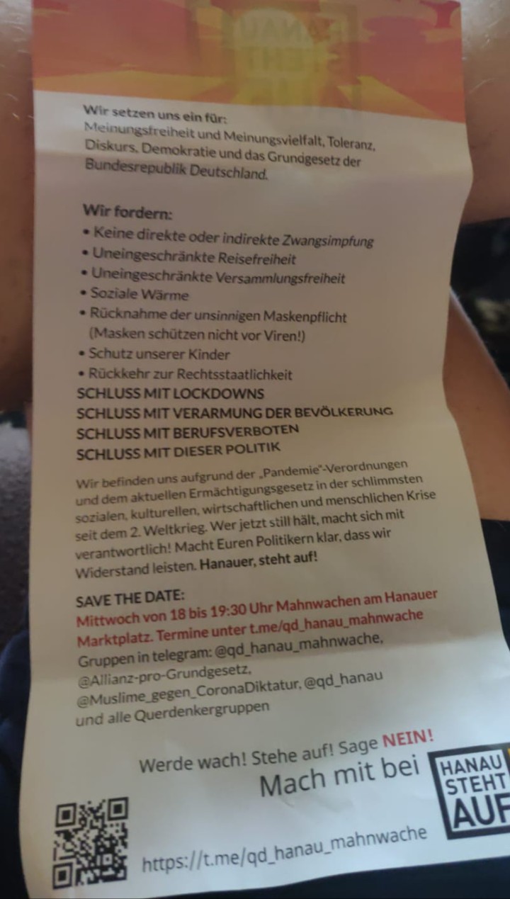 Guck Dir den Schwachsinn an, der zur Zeit hier in Hanau unter dem Slogan "Hanau steht auf" und "Hanau-Mahnwache" verteilt wird: