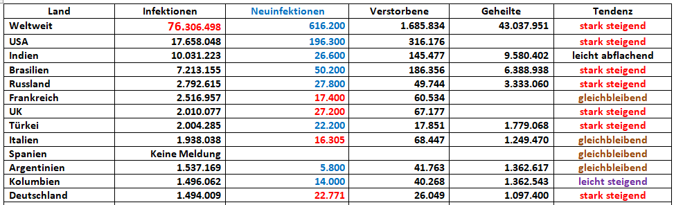 Fast die ganze Welt ist "beschissen" dran, leider. Für Deutschland wurden heute wieder Horrende Zahlen gemeldet, wer weiß, was nach dem 10.01.2021 noch an Maßnahmen erforderlich sein wird. Eine Entscheidung wird sicherlich schon vor dem 10.01.2021 getroffen werden müssen. ![]()