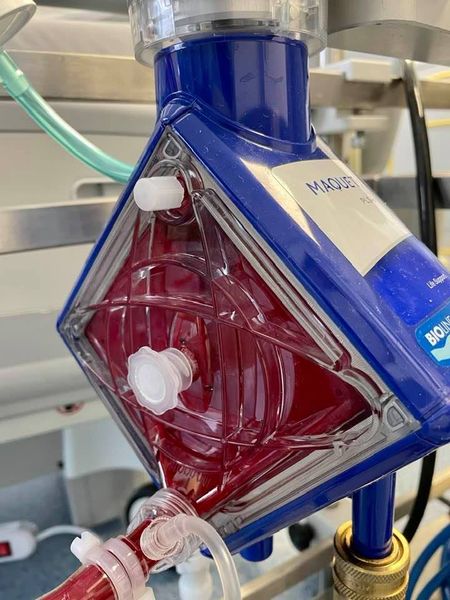 Aus meiner Pflegegruppe hier mal Bilder vom Oxygenator einer ECMO. Da sieht man wie sehr das Blut bei Covid 19 gerinnt und an den Polymethylpenten Fasern hängen bleibt. Die ECMO dürfte eigentlich jeder kennen, kommt zum Einsatz bei schweren Lungenerkrankungen wenn der Körper den Gasaustausch nicht mehr alleine hinbekommt. Der Oxygenator reichert das Blut mit Sauerstoff an und filtert das CO2 heraus. Die Funktion übernimmt sonst die Lunge. Die ECMO kommt bei Schwerstfällen zum Einsatz.