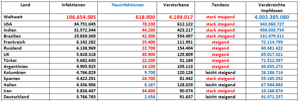 Woanders fehlen die Impfstoffe massiv, die Leut würden ihr letztes Hemd dafür geben sich vor der Krankheit halbwegs schützen zu können, und bei uns verrottet der Impfstoff. Hupsi Aiwanger schüttet noch Öl ins Feuer der Skeptiker und Gegner, unsere Politik eiert rum "naja, wenn wir sagen das ist alles easy dann ist das alles easy" mit Maßnahmen, die weder Fisch noch Fleisch sind, und nachher wundert man sich, wenn wieder viel zu viel Menschen infiziert werden, viel zu viele ernsthaft erkranken und man dann wieder die Notbremse reinhauen muß.