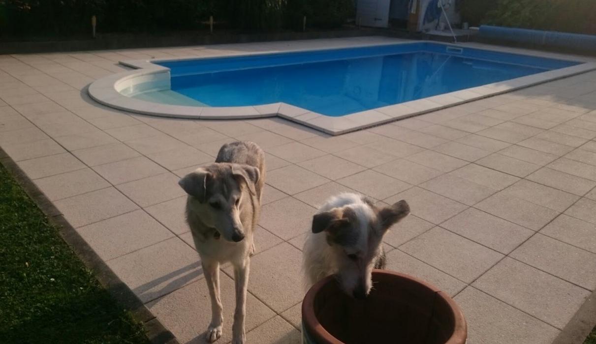 Auf dem ersten Foto vorne links: Socke, unser Sonnenschein und der verrückteste Hund, den wir jemals hatten (siehe letztes Foto). Socke haben wir von einer griechischen Auffangstation aus Athen und Socke ist ein fast reinrassiger Husky, der sehr gerne spielt.Vorne rechts: Kira, ein irischer Wolfshundmischling. Kira haben wir ebenfalls von einer griechischen Auffangstation aus Athen. Wir haben gute Kontakte zu Hilfsorganisationen in Griechenland und Mallorca und haben schon so manchem Hund ein neues Zuhause verschafft, wenn nicht bei uns, dann anderswo. Kira war anfangs sehr schreckhaft, hat aber die Scheu mittlerweile abgelegt. Es war aber ein sehr großes Stück Arbeit, um so mehr sind wir stolz, dass wir es mit viel Geduld geschafft haben.