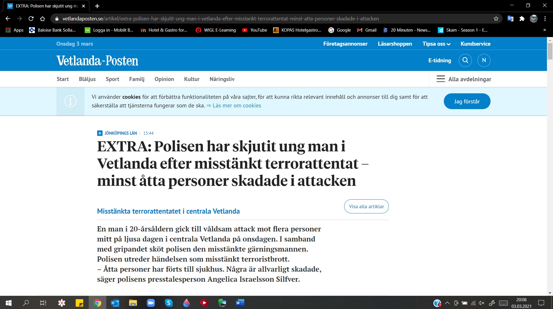 • Junger Mann durch Polizei nach vermutlichen Terrorangriff in Vetlanda-Schweden erschossen. 8 Verletzte (teils schwer) und 1 Toter (Angreifer)