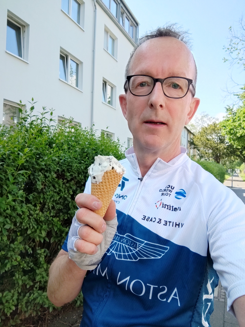 • Jörg, das Eis hast Du die ja verdient, nach einer Stunde Plagerei, aber sag mal, mir deinem Sportler Shirt oder bessergesagt mit dem Werbeaufdruck, gehört das so, steht doch alles verkehrt rum.