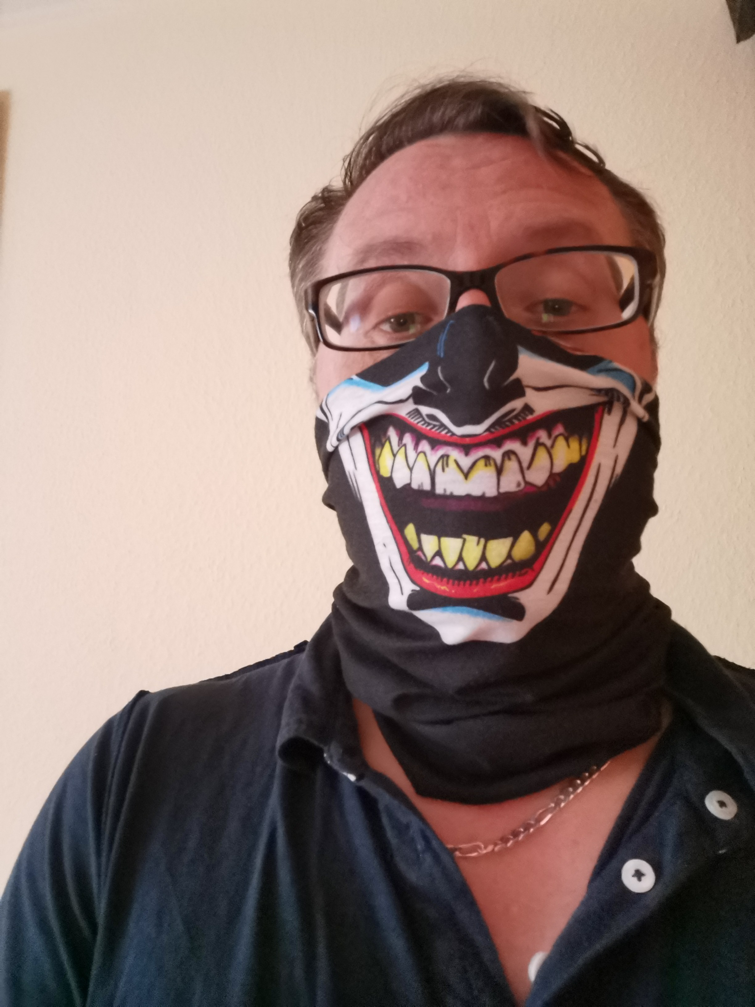 Von mir gibt's hier auch kein Maskenbild. Des reicht schon wenn ich auf Arbeit den ( leider sinnvollen) Mist stundenlang trage. Das ist wahrlich kein Spass. Gestern hab ich ein T-Shirt gesehen da stand drauf: Riechst du den Furz war der Abstand zu kurz. Das fand ich dann doch sehr witzig.