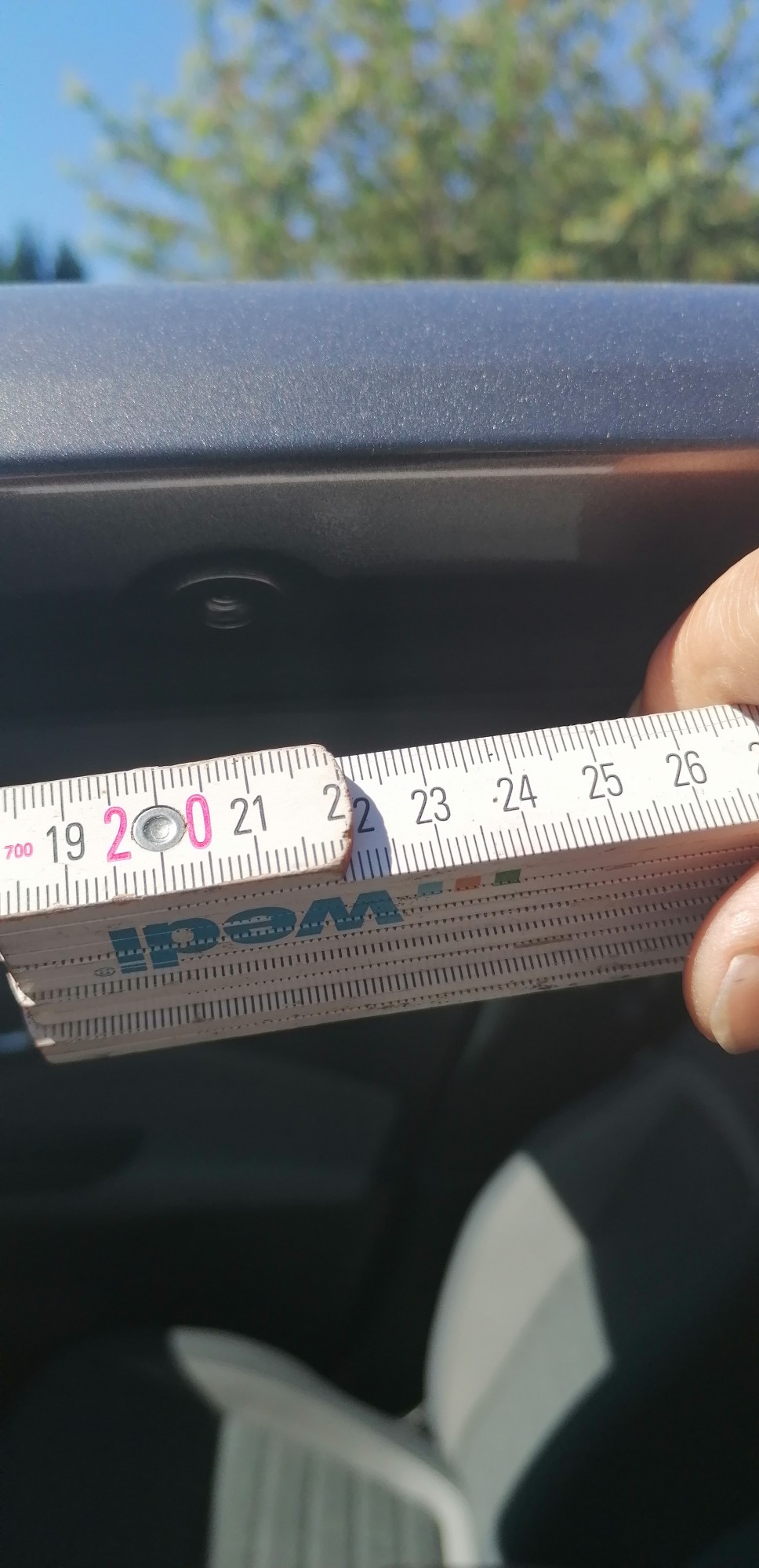 Hier die Fotos für die Verschraubungen des Dachgepäckträgers. Für das vordere Maß habe ich die Oberkante der Windschutzscheibe als Bezugspunkt genommen. Das zweite ist der Abstand vorderer und hinterer Befestigungspunkt.