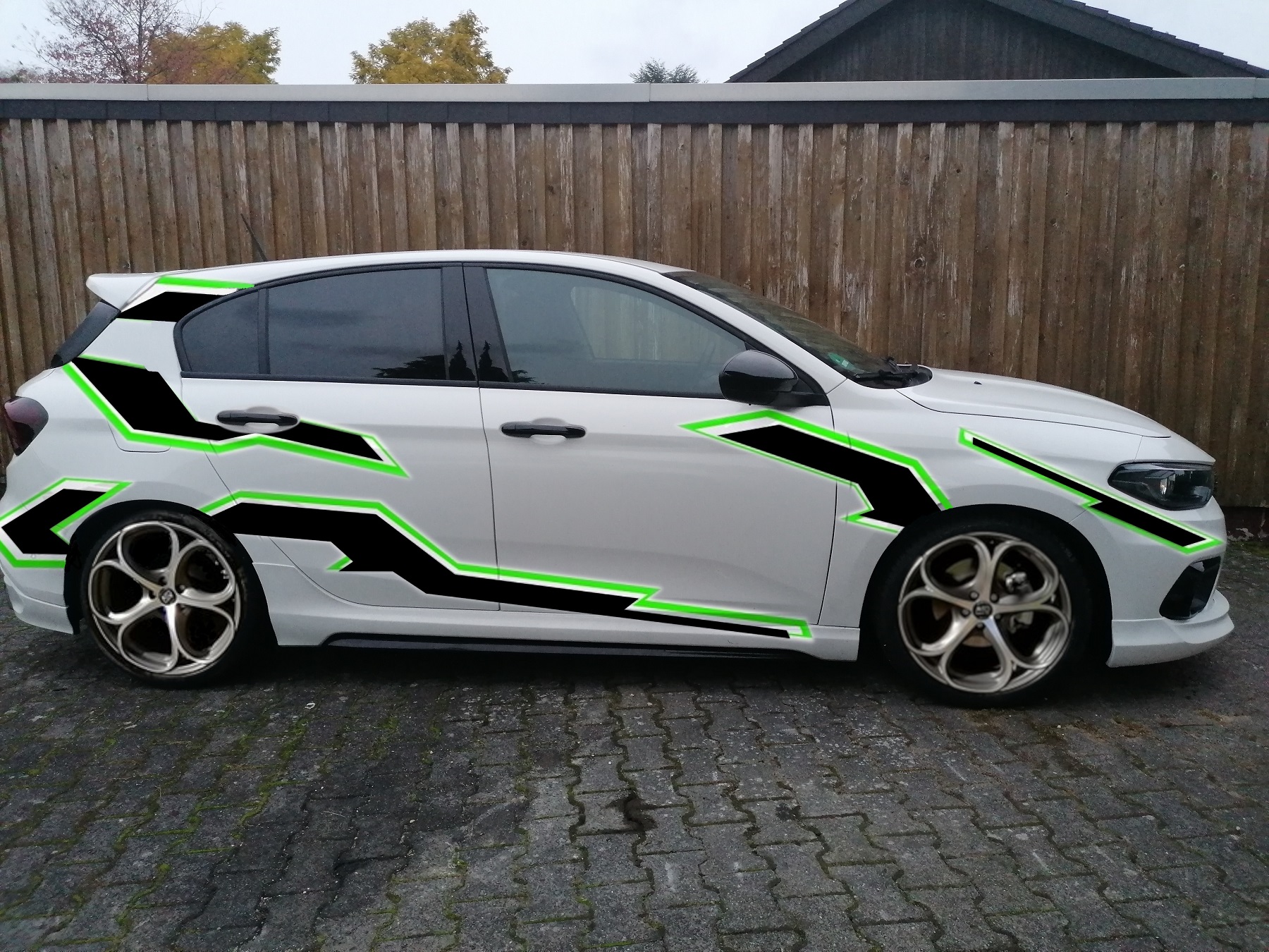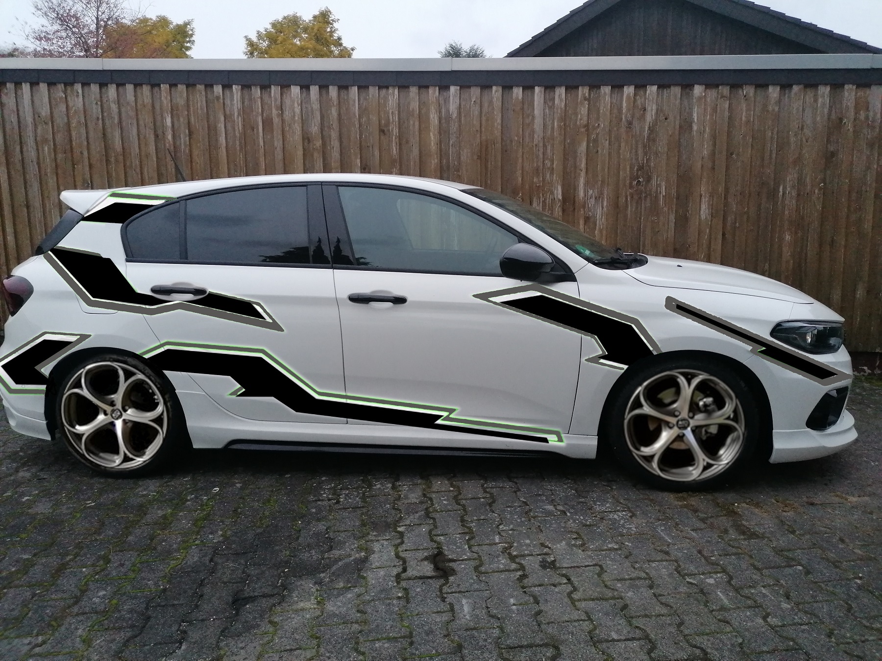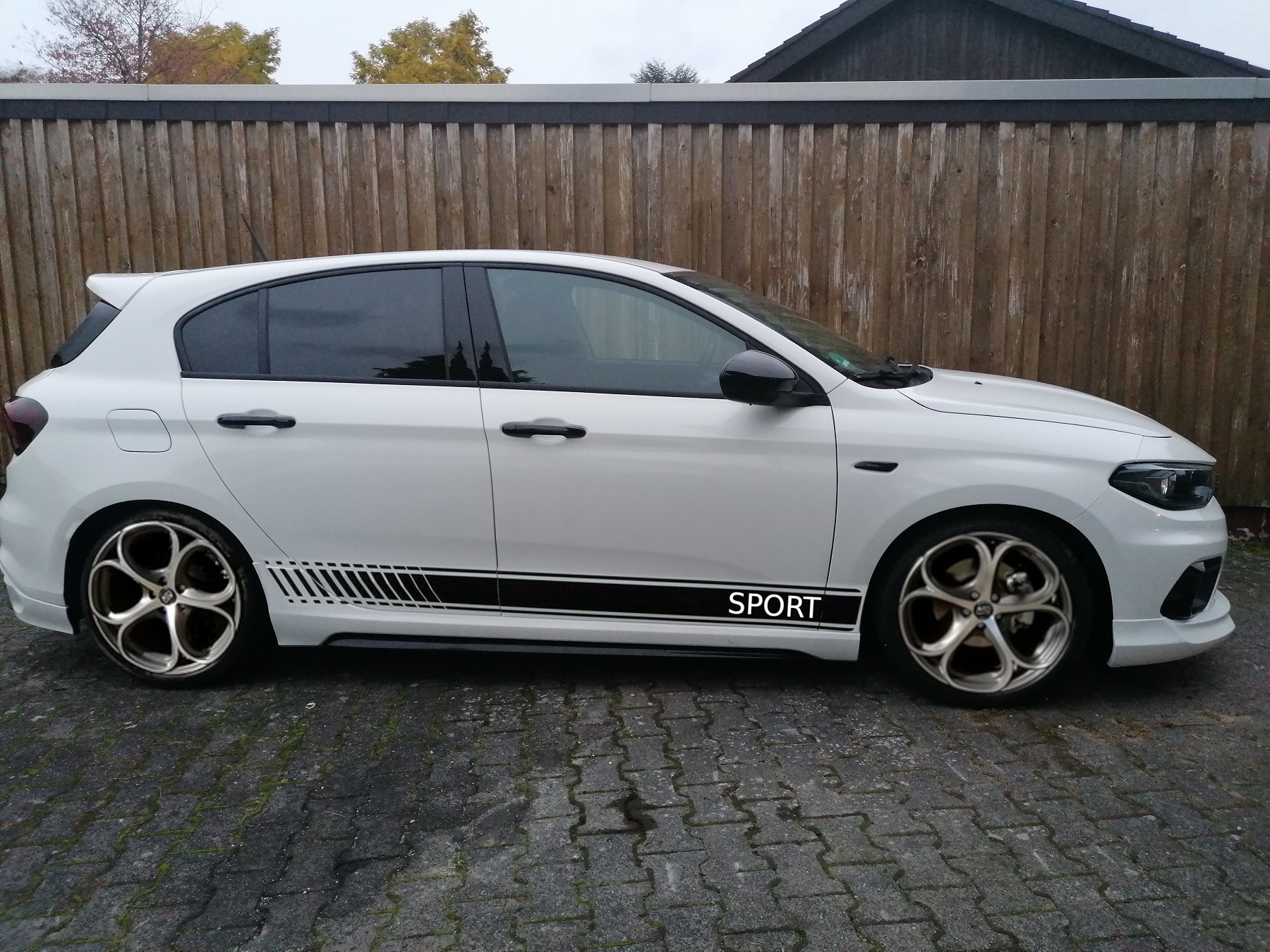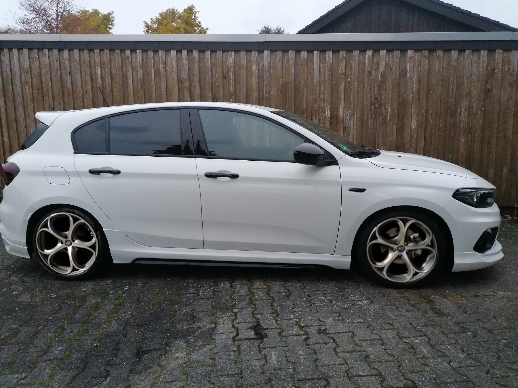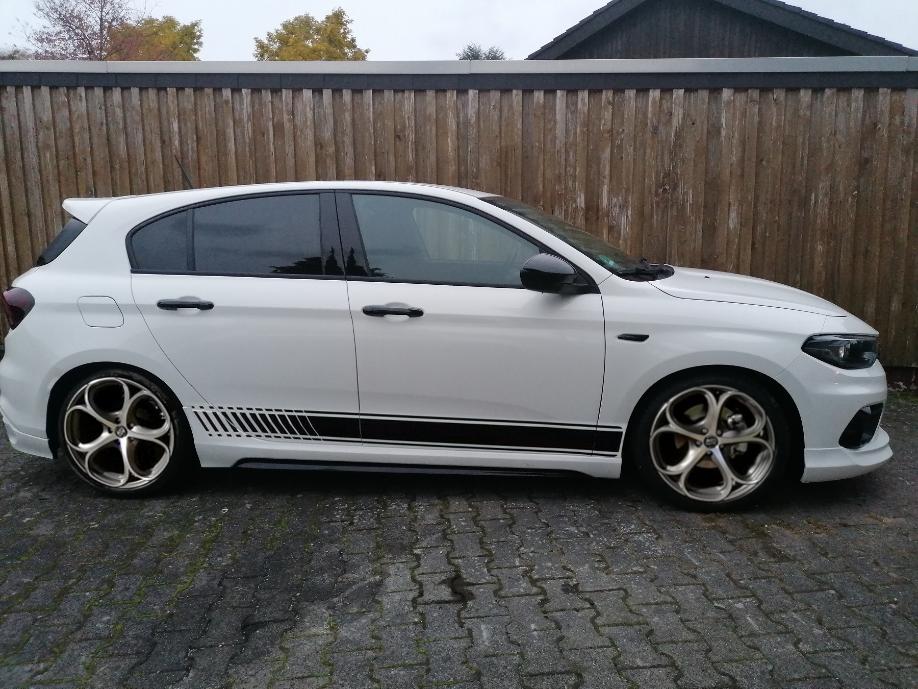 • Mein Fiat: Fiat Tipo Sport 1,4T-Jet, Vollausstattung, Leistungssteigerrung von Pogea Racing 147PS 300Nm, Sommer und Winterradsatz Dotz Spa Dark 8x18" ET35 225/40 18", Bilstein B8 Sportstoßdämpfer, H&R 40/35 Federn, Smoke Nebelscheinwerfer, K&N Sportluftfilter, Evolity Stahlflexbremsleitungen, Bremssättel schwarz lackiert, schwarze LED Seitenblinker, Schaltwegverkürzung Novitec, cleaner Kühlergrill (Eigenbau), Heckklappe clean (Schriftzug,Logo,Scheibenwischer entfernt), LED Facelift Heckleuchten, handgefertigte Edelstahl Abgasanlage ab Kat von Wimmer Rennsporttechnik 80er Doppelendrohr fahrzeugmittig, 200 Zellen Sportkat von Wimmer Rennsporttechnik, Sportlenkrad, MOMO Schaltknauf, überarbeitete Schaltmanschette, individuelle Fußmatten, Kurzstabantenne Simoni Racing, Motoranbauteile lackiert, diverse Silikonschläuche, Dämmmatte Motorraum zu Showzwecken überarbeitet, Haubenlift, LED Fernlicht, Zusatzinstrument in A-Säule (Ladedruck,Öldruck,Öltemperatur,Boardspannung), DTE Pedalbox, Hifiausbau Audison SR 5.600 Verstärker, Frontsystem Audison AV K6, Hecksystem Audison AV 6.5, Subwoofer Hertz MP 300 D4.3 Pro, Hochtöner in Spiegeldreiecke verbaut, Subwoofer in Reserveradmulde verbaut,