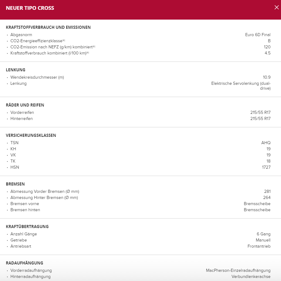 Tipo Cross - Technische Daten 1.6 96KW (130PS)