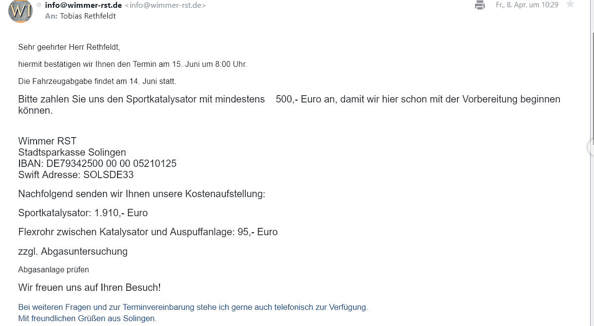 Ich könnte den kaufen,selber einbauen oder irgendwo einbauen lassen. Aber dann müsste ich das ganze noch selber beim TÜV vorführen und abnehmen lassen. Und das wäre viel kostenintensiver und aufwendiger als wie bei Wimmer. Und da wäre es nichtmal klar, ob das ganze dann überhaupt abgesegnet wird am Ende.