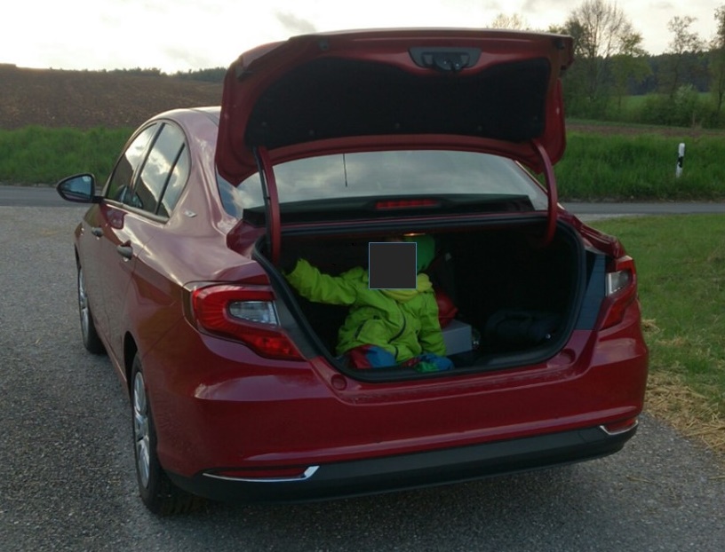 Oha...nicht angeschnallt, kein Kindersitz und auch noch Kofferraum offen.