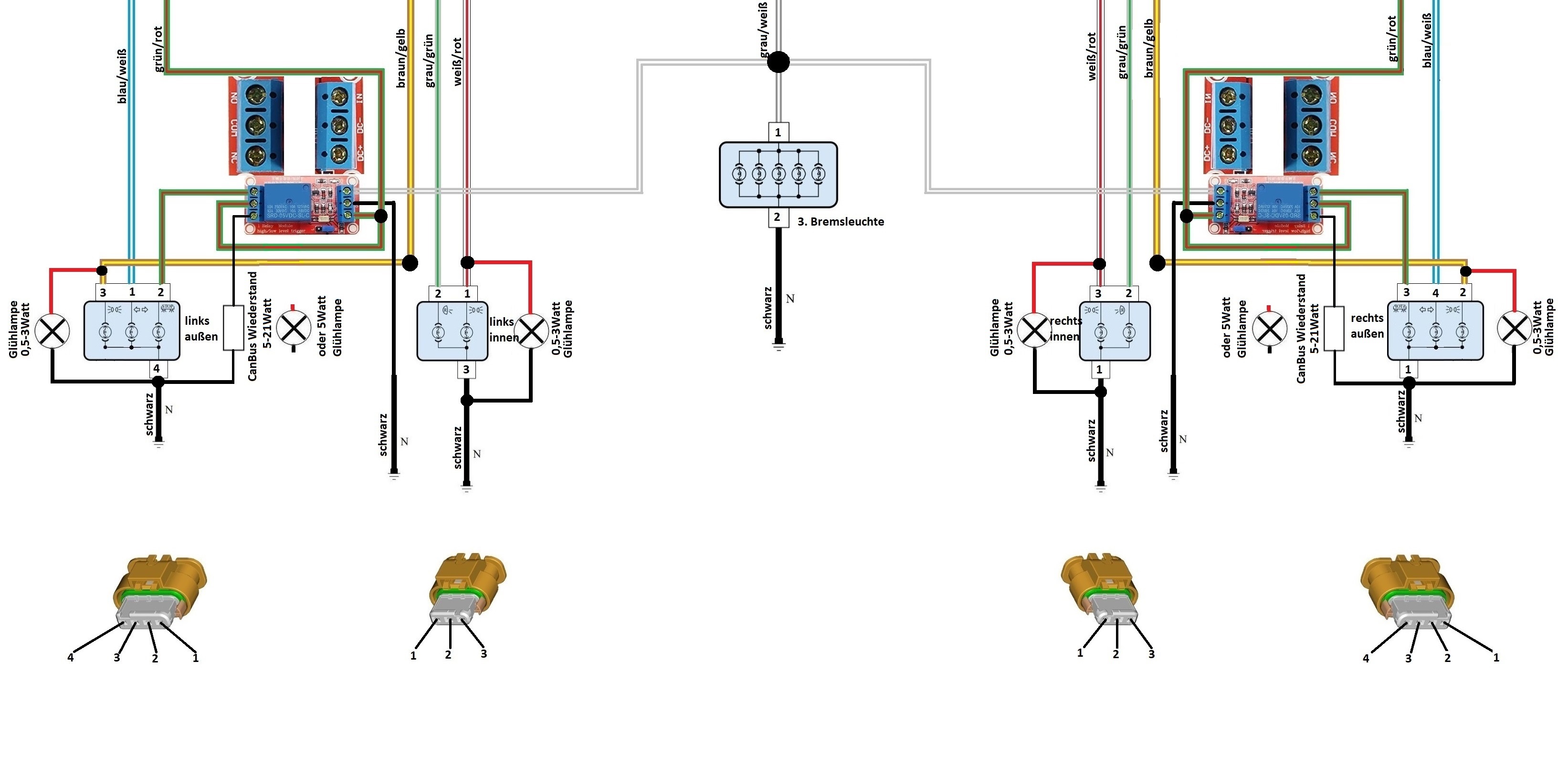 Was mir auffällt, du hast für die Spannungsversorgung der Relais das originale Kabel der Bremsleuchte genommen, klappt das einwandfrei, ist ja mit PWM, da sind ja nur beim bremsen volle 12 Volt drauf ?