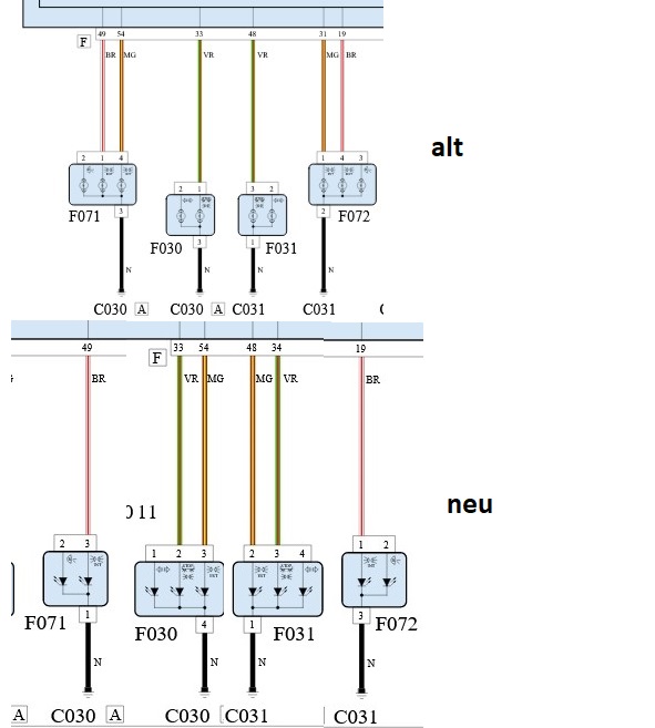 • nein, das glaube ich nicht, beachte, dass F030 und F071 auch im Plan getauscht sind. Man muss da ganz in Ruhe schauen. F030 ist die äußere Leuchte und die hat alt vier Kontakte jetzt nur drei. Das Brems/Rücklichtsignal und der Blinker liegen jetzt dort an. Und das alleinige Rücklichtsignal ist nach innen gewandert.