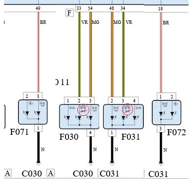 nein, das glaube ich nicht, beachte, dass F030 und F071 auch im Plan getauscht sind. Man muss da ganz in Ruhe schauen. F030 ist die äußere Leuchte und die hat alt vier Kontakte jetzt nur drei. Das Brems/Rücklichtsignal und der Blinker liegen jetzt dort an. Und das alleinige Rücklichtsignal ist nach innen gewandert.