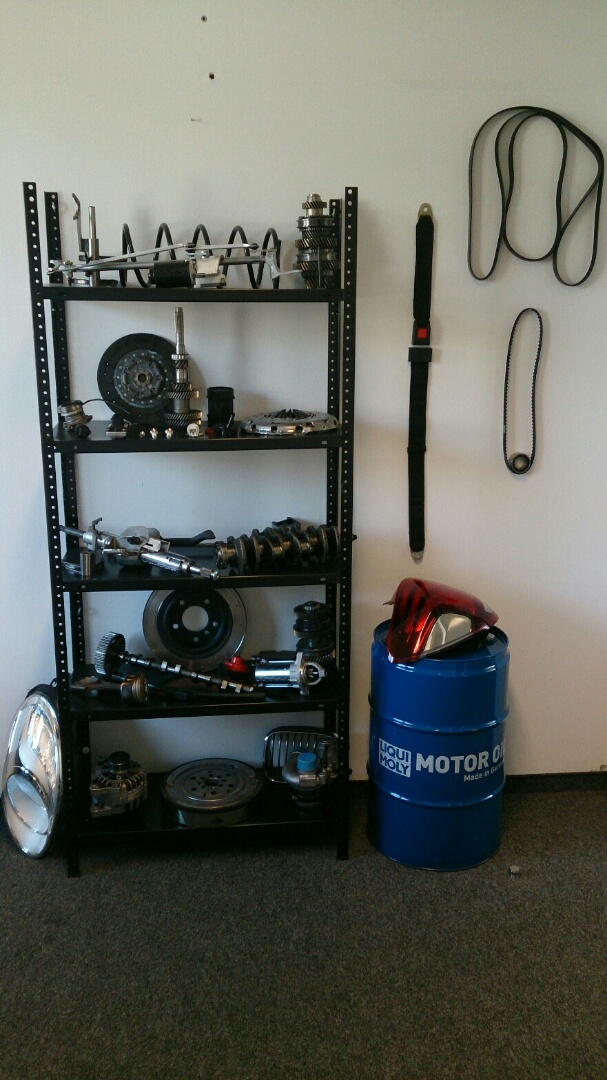 Das Regal ist ja schon recht voll bei mir: Bremsscheiben, Bremsklötze, Kupplungssatz, Zweimassenschwungrad, Kurbelwelle, Nockenwelle, Feder, Getriebe, Luftmassenmesser, Kolben, Ventilstösel, diverse Filter, BMW Niere, Hupe, Lenkgestänge, Koppelstange, Wischer.