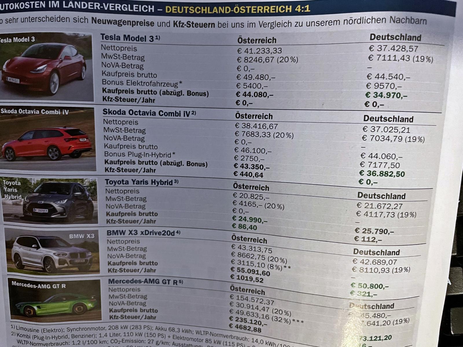 Österreich hat viel höhere Steuern und Abgaben, z. B. gibts die NoVA bei euch gar nicht."Alles Auto" hatte zuletzt einen schönen Vergleich mehrerer Modelle gebracht (siehe Foto).