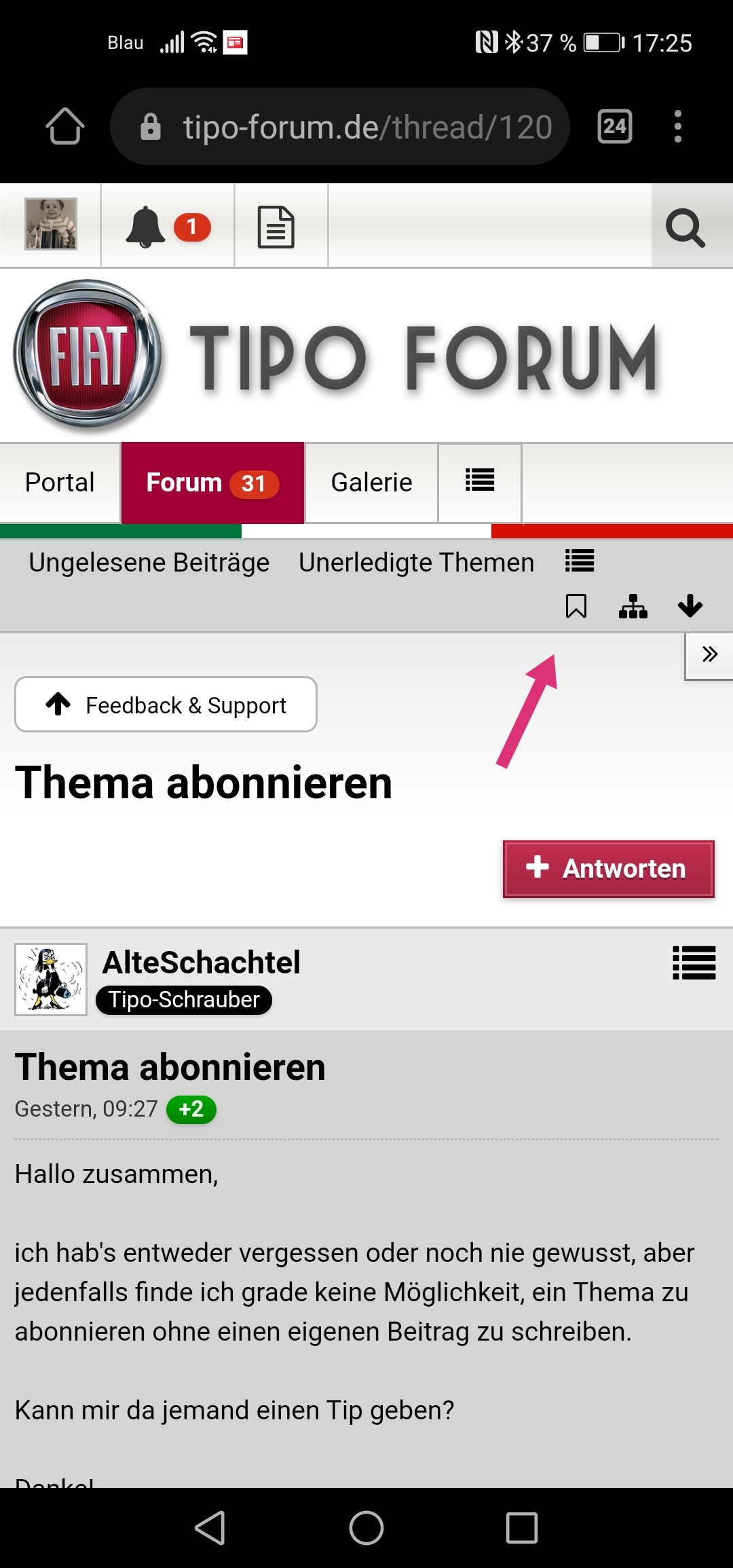 Häh? Ich will doch kein neues Thema erstellen, sondern einfach einen bestehenden Thread auf meine Abo-Liste setzen.
