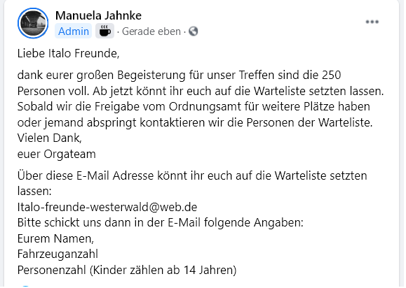 dank eurer großen Begeisterung für unser Treffen sind die 250 Personen voll. Ab jetzt könnt ihr euch auf die Warteliste setzten lassen. Sobald wir die Freigabe vom Ordnungsamt für weitere Plätze haben oder jemand abspringt kontaktieren wir die Personen der Warteliste.