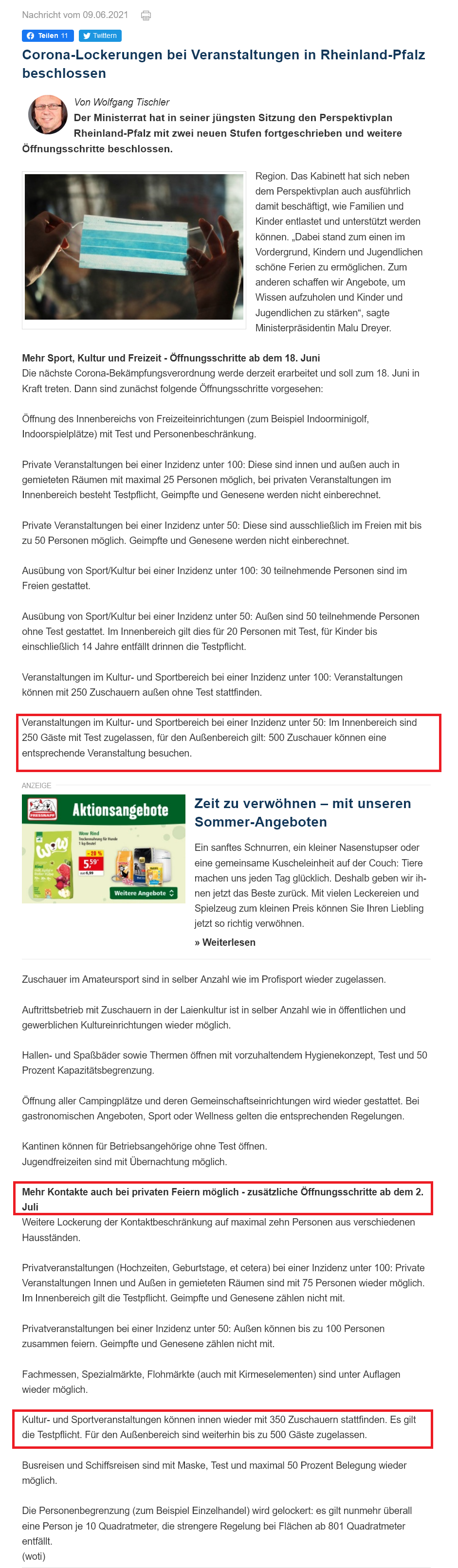 Wenn die Fallzahlen so bleiben bzw. noch runter gehen hier bei uns sind ab dem 2. Juli weitere Lockerrungen schon in Planung. Das würde heißen, es könnten bis zu 500 Teilnehmer zugelassen werden!