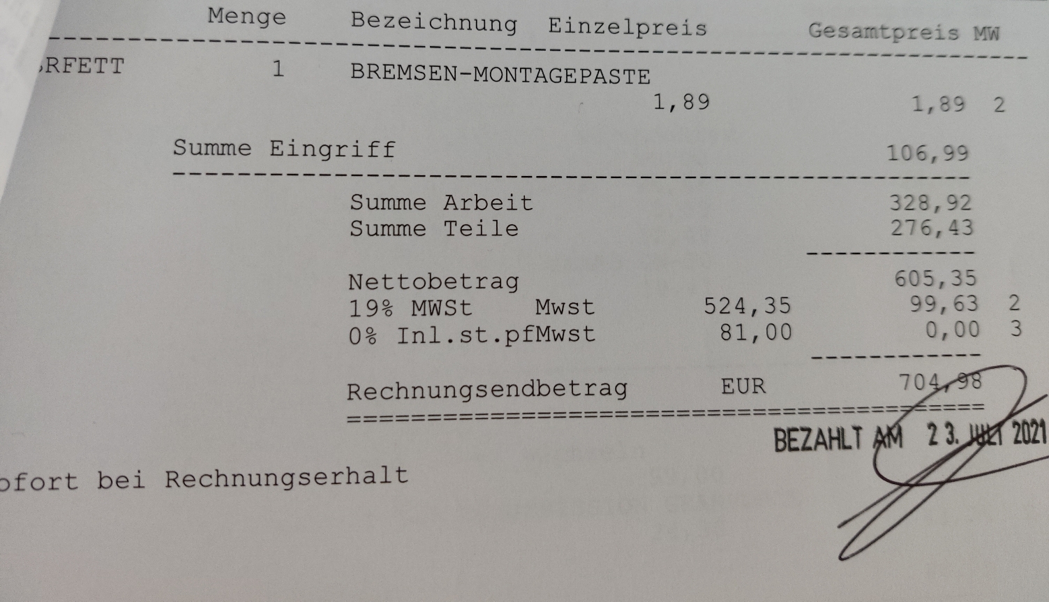 Wenn ich das richtig lese gehen sie von 1,7 Arbeitsstunden aus. Stundensatz von 102,50€ ist auch sportlich für eine Freie Werkstatt - bestimmt der TV Zuschlag. Na, ich bin gespannt....