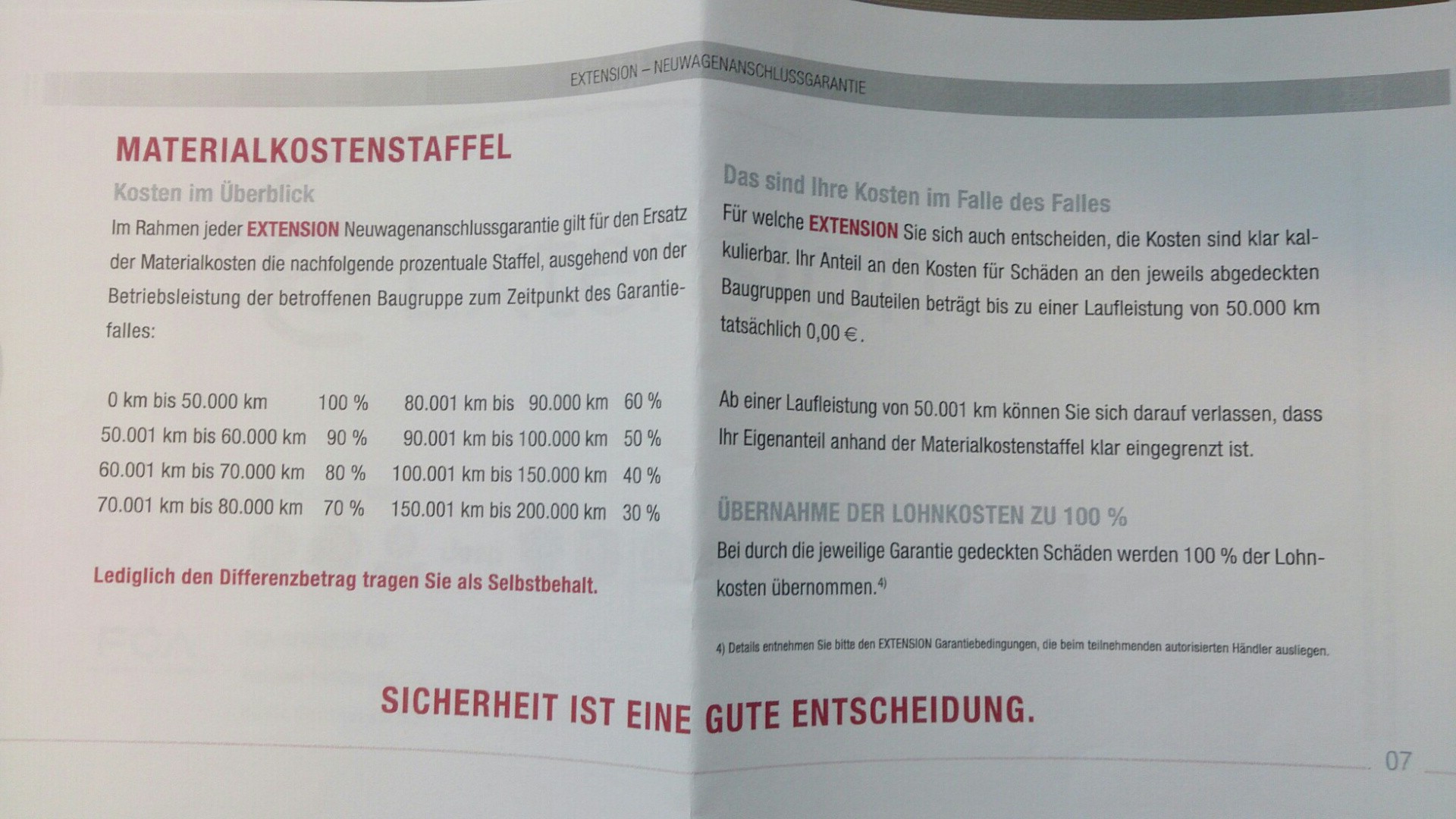 So, Leute, ich war heute morgen beim großen FCA Händler Dirkes in Köln, denn ich wollte etwas mehr über die Neuwagenanschlussgarantie Extension erfahren. Zum Hintergrund: ich habe im Juni 2016 ein Leasingfahrzeug erworben und 20.000 Kilometer Jahresleistung kalkulieren lassern. Nach jetzigem Stand werde ich den Wagen nach 4 Jahren auch übernehmen, auch wenn er dann bereits 80.000 runter haben sollte.