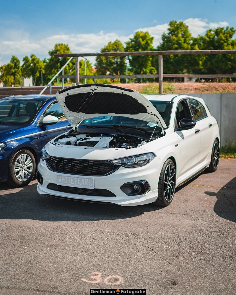 Mein Fiat: Fiat Tipo Sport 1,4T-Jet, Vollausstattung, Leistungssteigerrung von Pogea Racing 147PS 300Nm, Sommer und Winterradsatz Dotz Spa Dark 8x18" ET35 225/40 18", Bilstein B8 Sportstoßdämpfer, H&R 40/35 Federn, Smoke Nebelscheinwerfer, K&N Sportluftfilter, Evolity Stahlflexbremsleitungen, Bremssättel schwarz lackiert, schwarze LED Seitenblinker, Schaltwegverkürzung Novitec, cleaner Kühlergrill (Eigenbau), Heckklappe clean (Schriftzug,Logo,Scheibenwischer entfernt), LED Facelift Heckleuchten, handgefertigte Edelstahl Abgasanlage ab Kat von Wimmer Rennsporttechnik 80er Doppelendrohr fahrzeugmittig, 200 Zellen Sportkat von Wimmer Rennsporttechnik, Sportlenkrad, MOMO Schaltknauf, überarbeitete Schaltmanschette, individuelle Fußmatten, Kurzstabantenne Simoni Racing, Motoranbauteile lackiert, diverse Silikonschläuche, Dämmmatte Motorraum zu Showzwecken überarbeitet, Haubenlift, LED Fernlicht, Zusatzinstrument in A-Säule (Ladedruck,Öldruck,Öltemperatur,Boardspannung), DTE Pedalbox, Hifiausbau Audison SR 5.600 Verstärker, Frontsystem Audison AV K6, Hecksystem Audison AV 6.5, Subwoofer Hertz MP 300 D4.3 Pro, Hochtöner in Spiegeldreiecke verbaut, Subwoofer in Reserveradmulde verbaut,