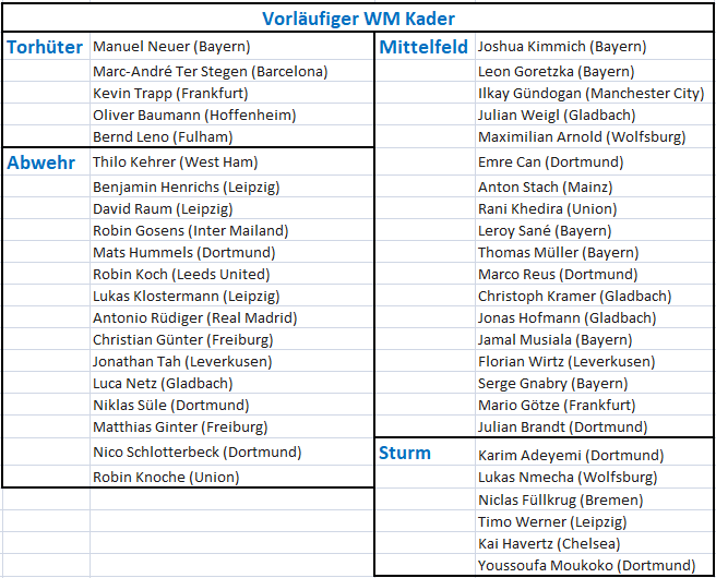 Der endgültige Kader, 26 Spieler, müssen bis zum 13.11.2022 der FIFA gemeldet werden!