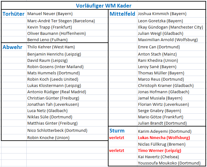 Der endgültige Kader, 26 Spieler, müssen bis zum 13.11.2022 der FIFA gemeldet werden!