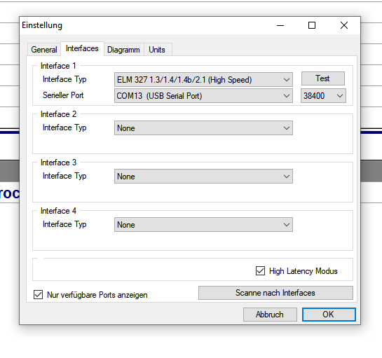 Die 38400 Baud waren bei mir schon eingestellt, ob das standard ist oder ob ich das mal eingestellt habe weiß ich nicht. Hab dann mal 115200 Baud umgestellt und den Test gestartet, da kam sofort eine Timeout Meldung. Mit 38400 funktioniert der Test.