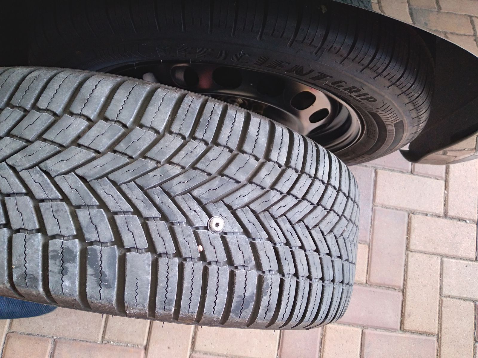 Und da sah dann der linke Vorderreifen etwas bauchig aus - 1,5Bar standen auf der Anzeige und das steckte in der Lauffläche drin. Wieder das Ersatzrad aus dem Kofferraum geholt und drauf geschraubt. Nichtmal eineinhalb Jahre nach der Schraube im Reifen auf der rechten Seite vorne, nun die linke...