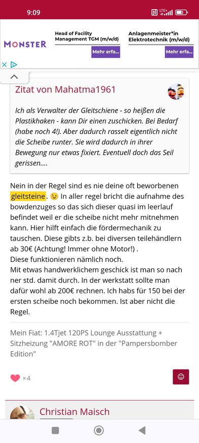 • Mir ist ja auch die linke Vorderscheibe mal fast runtergerasselt. Es knackte laut und dann blieb sie mit einer 10%igen Öffnung hängen. Bin aber zur Werkstatt und die haben für 250€ komplett die Mechanik ohne Motor gewechselt. Habe seitdem einen Heber mit und einen Heber ohne Motor (rechts & links) auf Lager. Plus die Gleitsteine, die übrigens die Werkstatt nicht kannte. Beim Glaseinbruch im Sommer in Südtirol konnte ich bei Carglass die Neuanlieferung sehen; Scheibe inkl. Gleitstein.