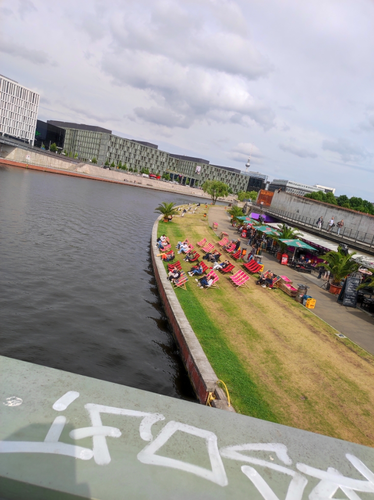 Berlin vis a vis vom HBF. Hänge mit Berliner Weiße im Sonnenstuhl an der Spree. Schmeckt.