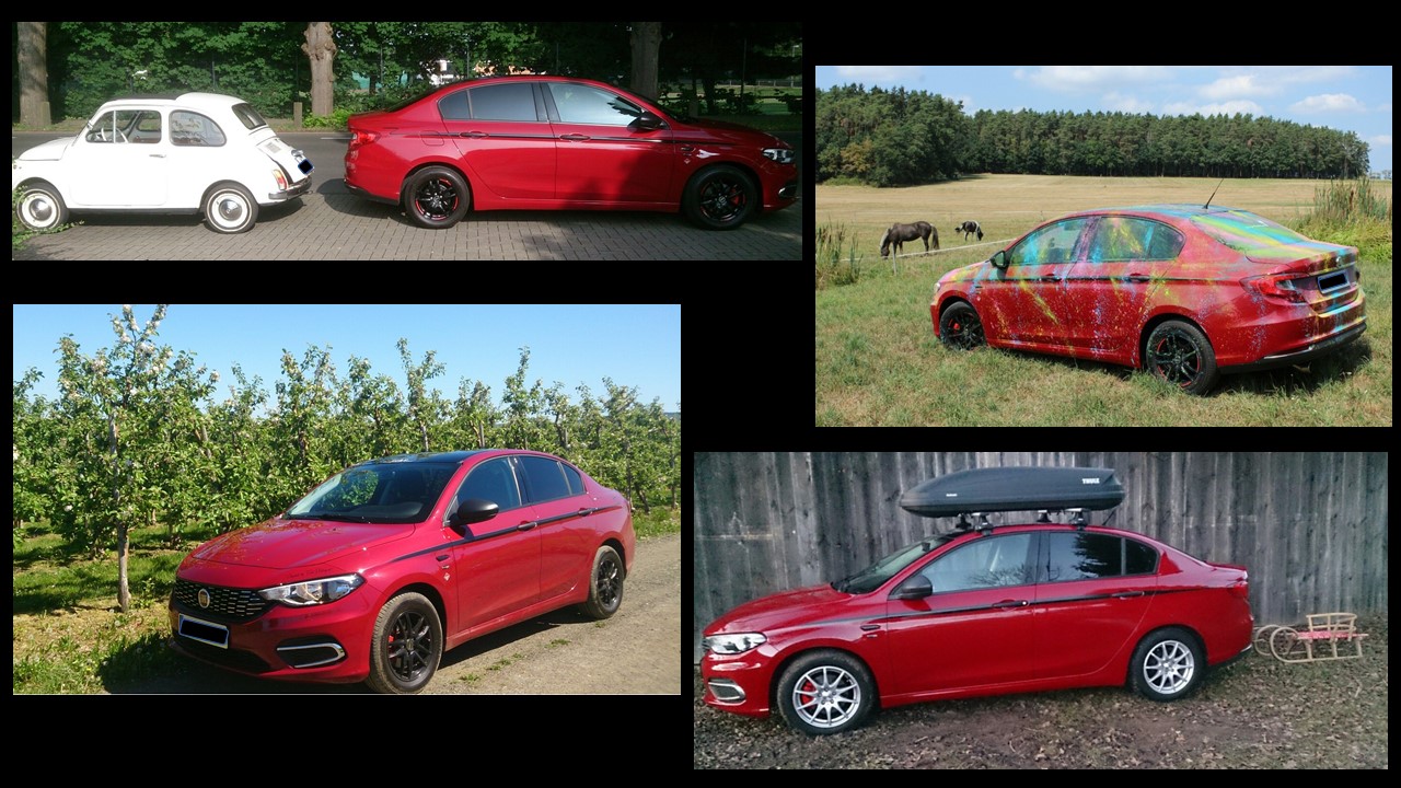 Mein Fiat: Tipo Limousine, Pop, Tech-Paket, 95 PS, Benziner, rot, Vogtlandfedern, Bilsteindämpfer, Dach- und Frontspoilerfolierung, EZ: 6/2016, 130.500 Kilometer; Renault Clio 3, Benziner, blau, 75 PS, EZ: 3/2008, 223.500 km