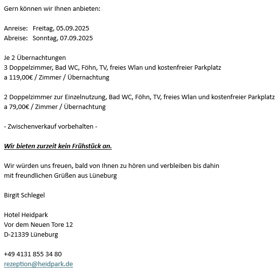 Das Hotel Heidpark ist für das WE im September gebucht.