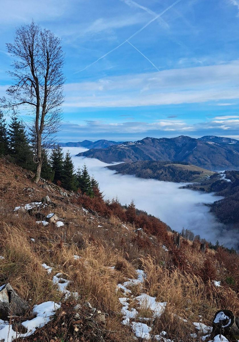 • Raus aus dem Nebel, kalt ist es oben auch, aber wenigstens mit Sonne.