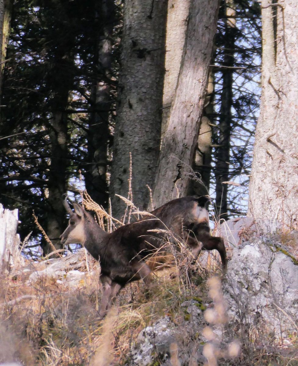 Wer ganz genau hinschaut entdeckt auf einem Foto sogar eine junge Gams. Leider nicht gut zu sehen weil sie genau so überrascht war wie meine Frau mit dem Handy und alles schnell ging.