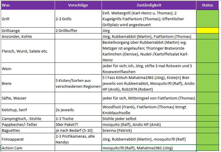 Zwischenzeitlich kam von Thomas (Fiatfantom) der Hinweis, dass er einige antialkoholische Getränke, 2 Kugelgrills, Holzkohle und Steaksoßen mitbringt. War tlws. bereits oben in der Tabelle.