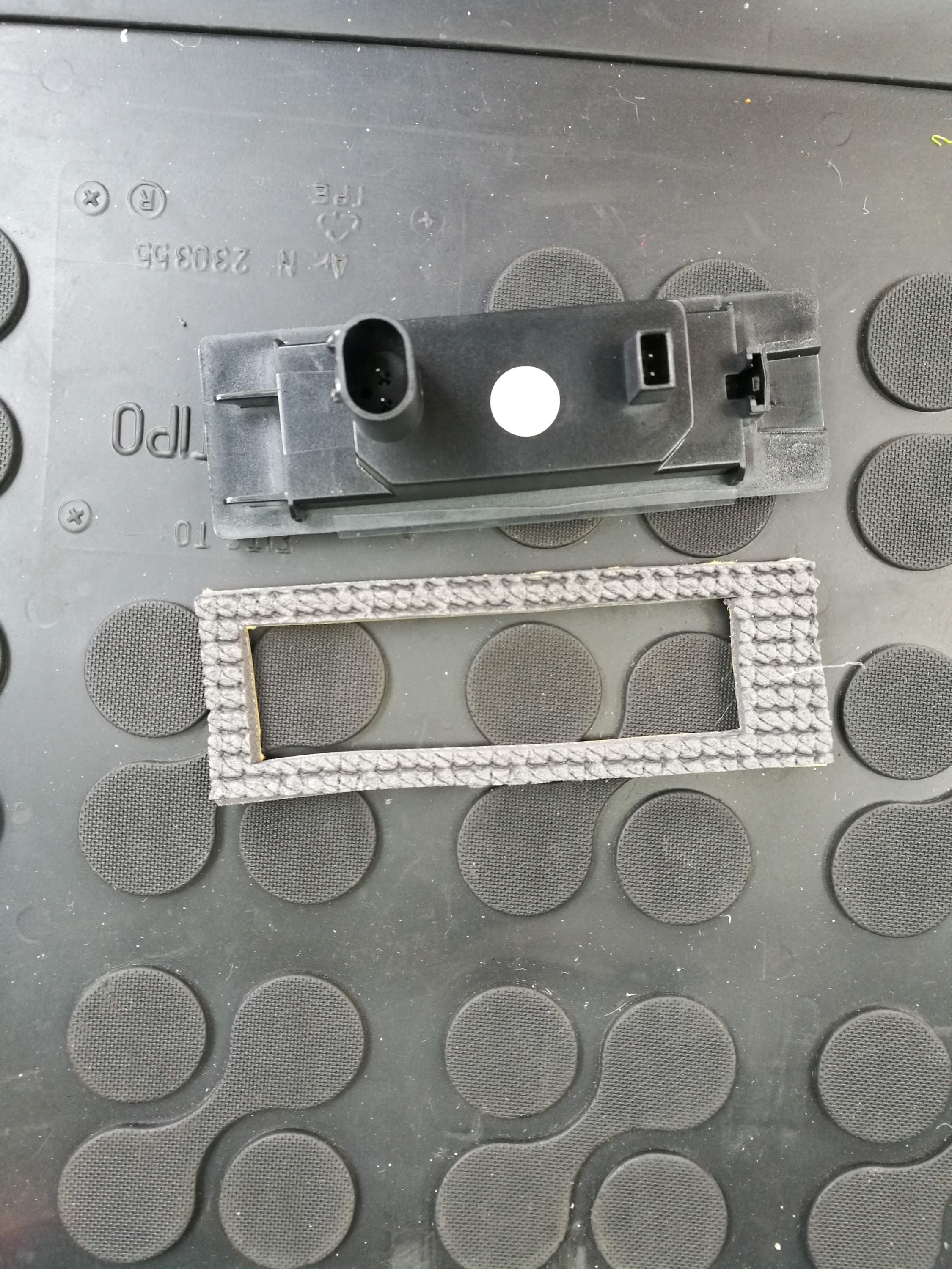Daraus flugs eine Dichtung geschnitten und aufgeklebt, die Halteklammer habe ich zum leichteren kleben der Dichtung aus der Leuchte rausgenommenNach Bearbeitung der Kanten mit dem Cuttermesser sieht es dann wie folgt aus