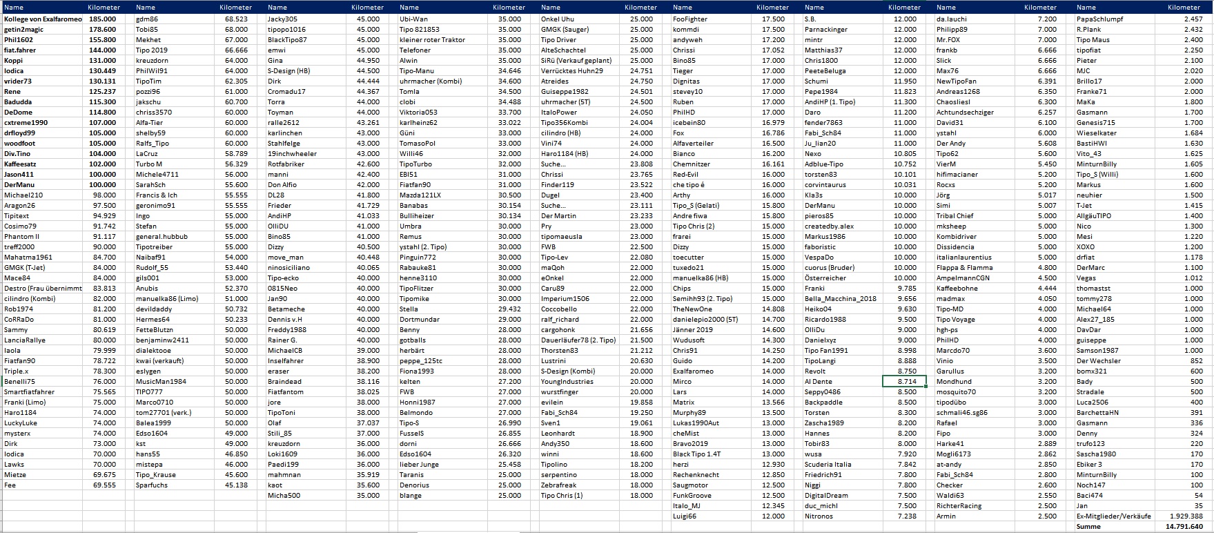 • Jörg - kann man nicht die Liste um den Punkt "Diverse" ändern, und dort diejenigen zusammenfassen, die sich schon zwei Jahre oder mehr nicht mehr gemeldet haben.Gerade bei den runden Zahlen, z.B. 30.000 oder 40.000km , sehe ich einige, die nicht mal ich kenne!