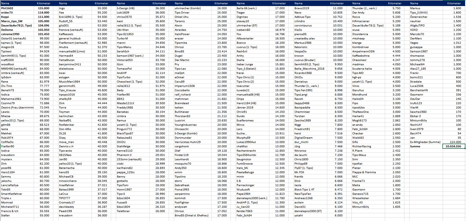 Machen wir es kurz: wenn jemand die Datei pflegen möchte, kann er mich anschreiben und ich schicke die Exceltabelle. Ansonsten sind natürlich Kilometerinfos immer willkommen, aber sie werden nicht mehr notiert und upgedatet. Zum Monatsende gibt es übermorgen ein letztes Mal die Übersicht.....