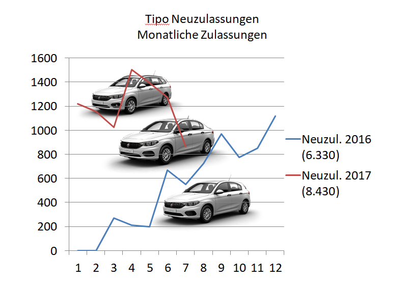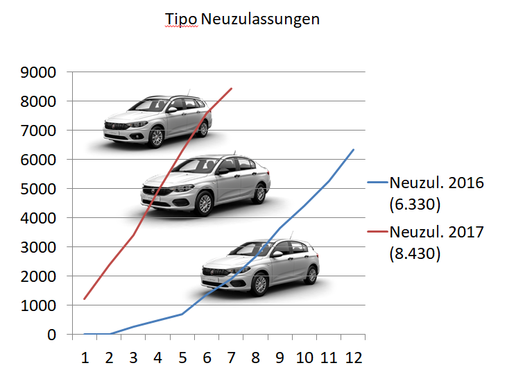 ja, die Neuzulassungen von unserem Tipo in D sind mager, in Ö hatten wir 2075 Neuzulassungen in ersten Halbjahr (ein Plus von 542.5 % gegenüber 2016), wenn man das mit der Einwohnerzahl hochrechnet, sollten es ca. 20k+ in Deutschland sein, um den selben Marktanteil zu erreichen.